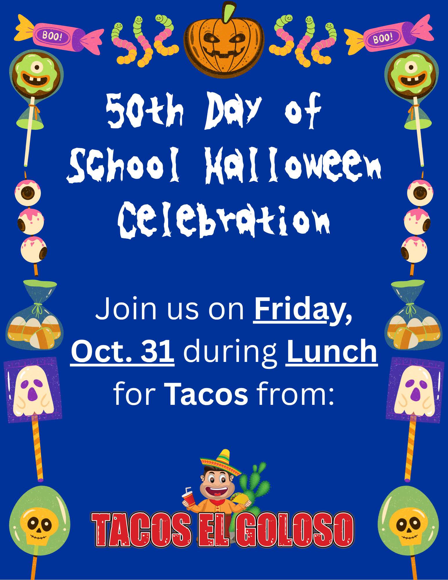 Este viernes celebraremos el día número 50 de clases con una divertida celebración de Halloween y Día de los Muertos, con música, pintura de caritas y tacos. ¡Asegúrense de que su hijo(a) venga a disfrutar la celebración!